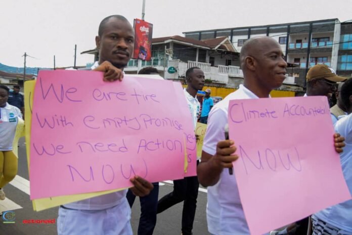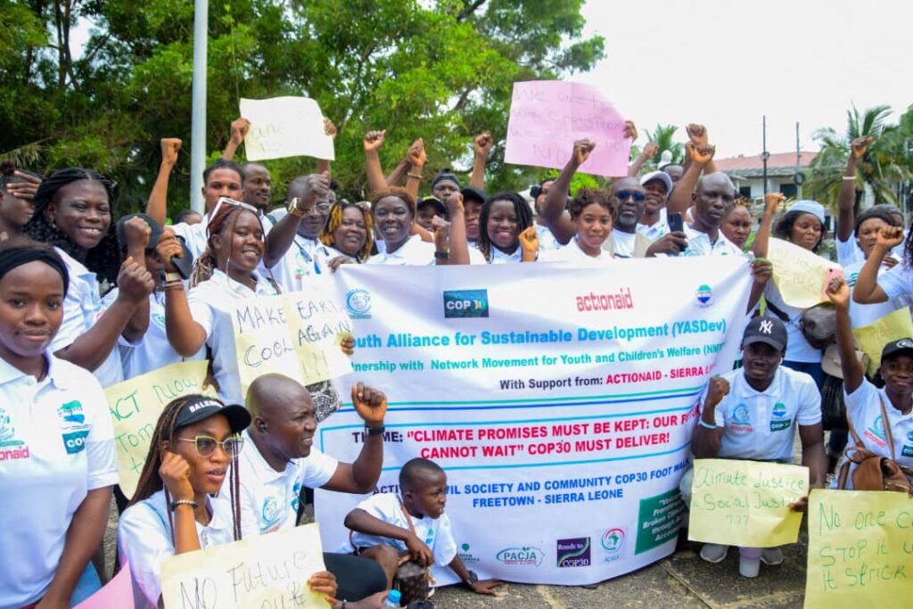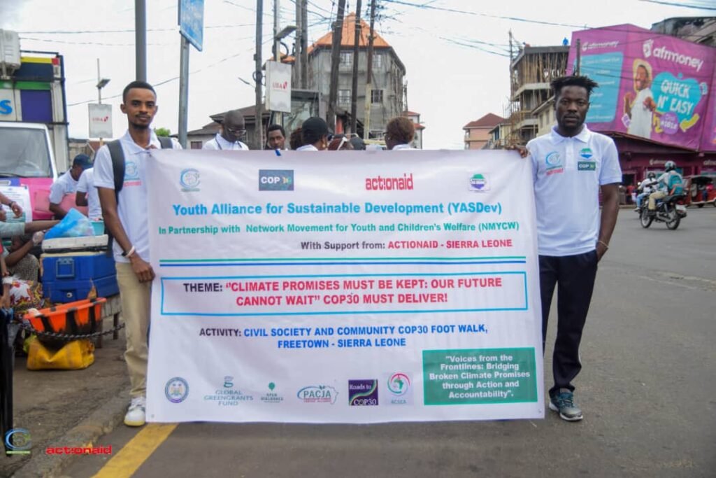 The event was organised by the Youth Alliance for Sustainable Development YASDev in partnership with the Network Movement for Youth, Women and Children Welfare (NMYWCW) with support from ActionAid Sierra Leone. The foot walk formed part of a global week of people-led mobilisations amplifying the voices of those most affected by the climate crisis and demanding climate justice, equitable finance, and stronger adaptation support.