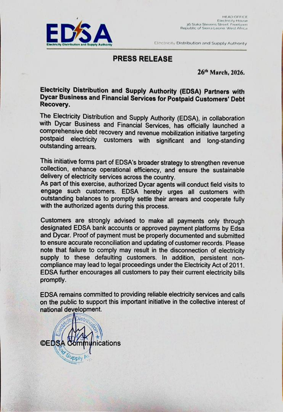 When the Electricity Distribution and Supply Authority (EDSA) announced on 26th March 2026 that it had partnered with Dycar Business and Financial Services to recover debts from postpaid customers, the move put a spotlight on a question many Sierra Leoneans ask: Who collects the light bill money, and what rules govern how they’re chosen?